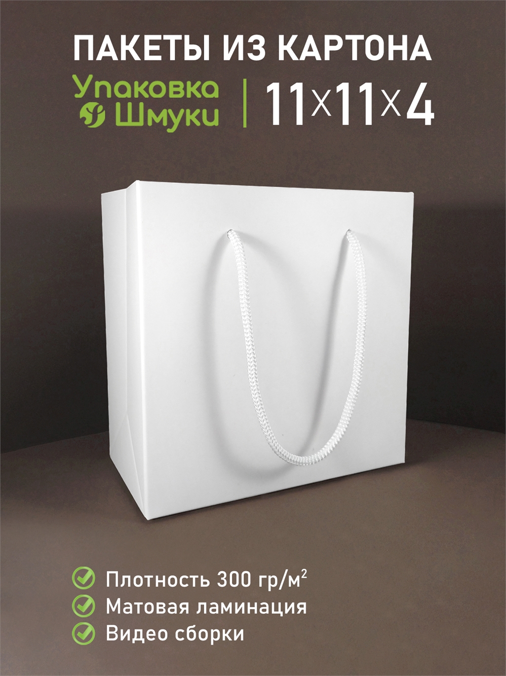 Пакет 11х11х4 см белый со сборным дном с тиснением логотипа с белыми ручками