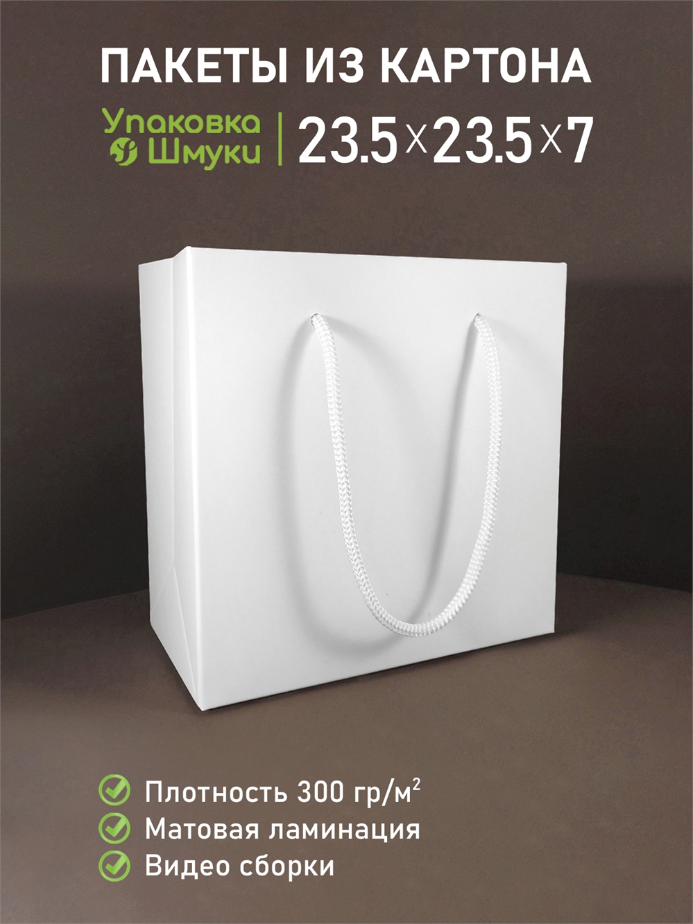 Пакет 23,5х23,5х7 см белый со сборным дном с тиснением логотипа с белыми ручками